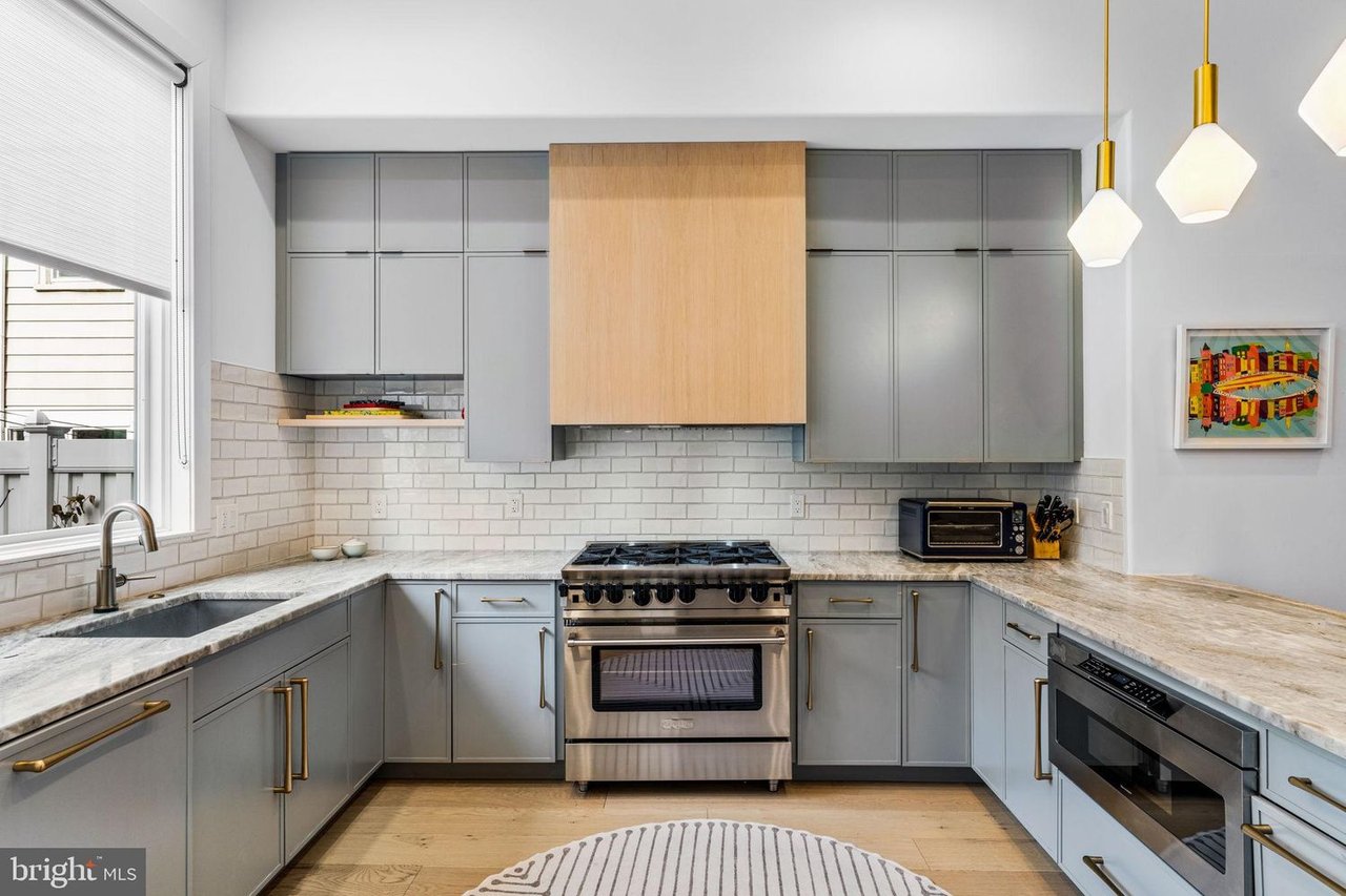Welcome to 722 S 19th Street, a one-of-a-kind 2021 build by Zatos Builders located in the Graduate Hospital neighborhood of Philadelphia. This thoughtfully designed property is filled with custom features and meticulous attention to detail. Step inside the expansive main level, where natural light pours through a large front window, highlighting the custom-built bookcase and desk in the living room. The dining area features a distinctive light fixture setting the perfect ambiance for gatherings. The beautifully crafted kitchen boasts custom paneling, a subway tile backsplash, stunning waterfall countertops, and premium appliances, including a gas range and built-in microwave. For added convenience, a reverse osmosis water filter is installed under the sink. A half bath and access to a fenced-in patio complete the space.